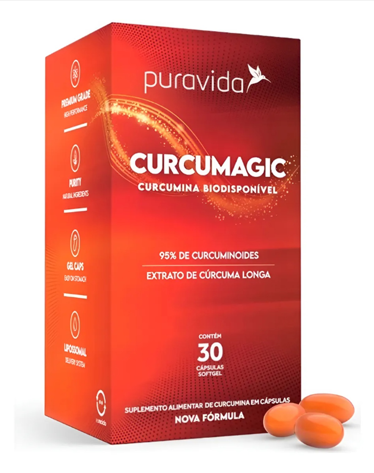 A Curcumagic Puravida é um suplemento de alta performance formulado com curcumina pura e biodisponível, o ativo mais nobre da cúrcuma longa.